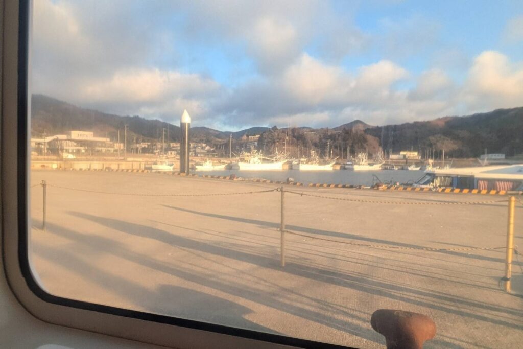 まずは女川港から、フェリーで移動です。乗船時間は約30分ほど。フェリー内はトイレやゴミ箱が設置されていて、座席が70席ほどあり、広々として快適でした。…が、わたしは海鳥を見つけるため、すぐに外の甲板へ出て景色に目を凝らして海鳥を探し始めました。
