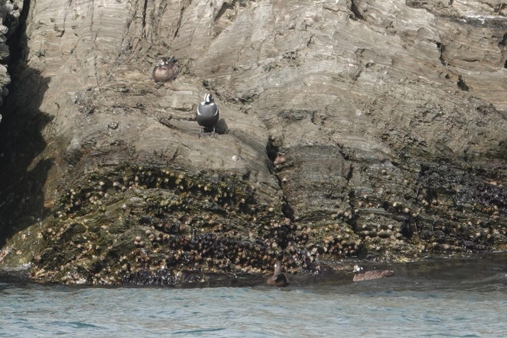 また、シノリガモの集団も見つけました。波が断崖にかかった時に、タイミングよく岩へ ひょいっと身を移すようにして止まっていました。