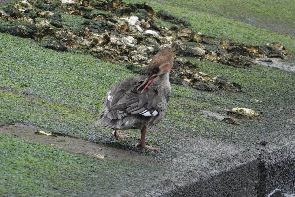 頻繁に潜り、食べものを探しているようでした。その近くには、漁港に上がって羽繕いをしているウミアイサも見つけました。